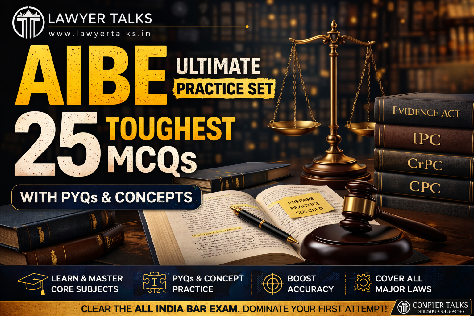 Prepare effectively for the All India Bar Examination with this ultimate set of 25 tough MCQs, combining previous year questions and advanced conceptual problems. Covering key subjects like IPC, CPC, CrPC, Evidence Act, Constitutional Law, and Contract Law, this set is designed to test your practical understanding and improve accuracy. A must-practice for candidates aiming to clear AIBE in the first attempt.