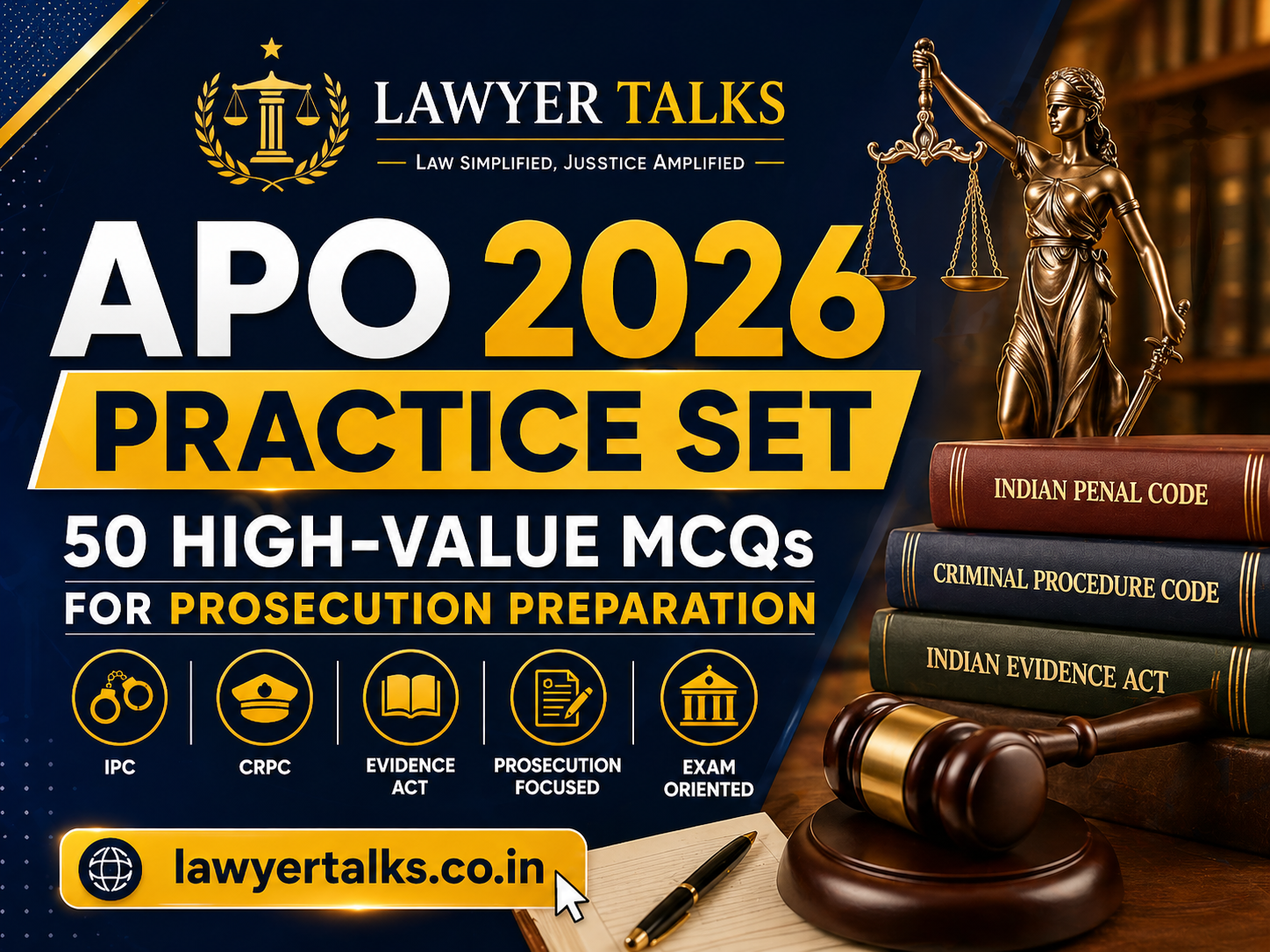 This set of 50 MCQs is tailored for APO aspirants, covering IPC, CrPC, and Evidence with a prosecution-oriented approach. Designed to strengthen legal application, procedural clarity, and exam readiness for state-level Assistant Prosecution Officer exams.