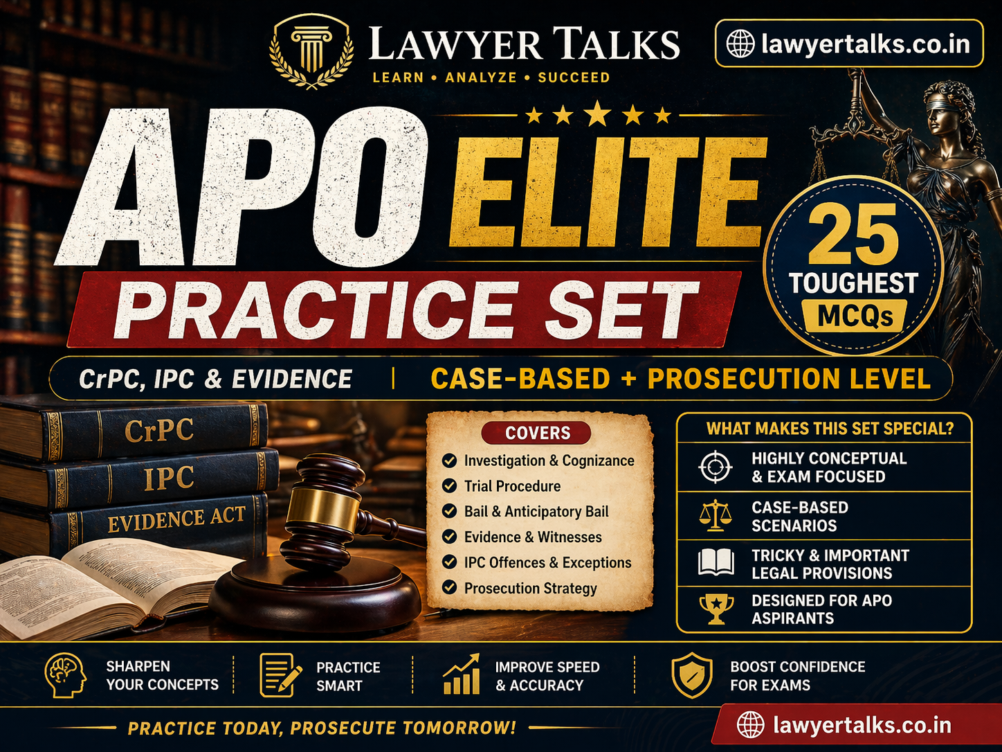 Test your prosecution skills with this APO Elite Practice Set featuring 25 high-level MCQs from CrPC, IPC, and Evidence. Designed with case-based scenarios and exam-focused concepts to help you practice smart and perform confidently.
