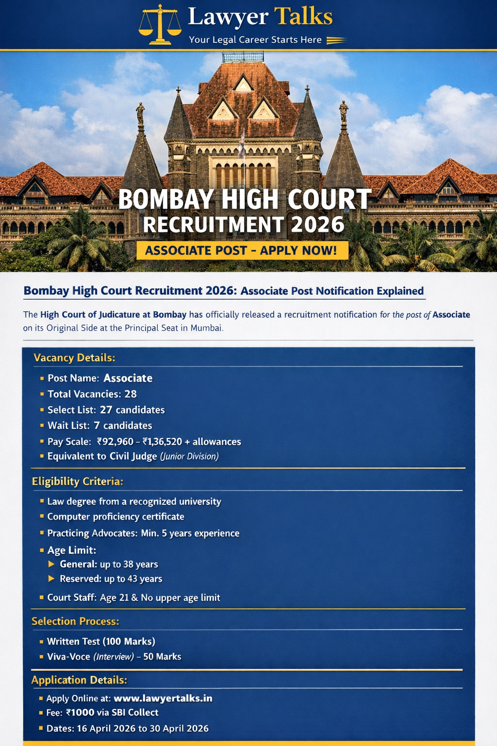 The High Court of Judicature at Bombay has posted a recruitment notice of the post of Associate on its Original Side at the Principal Seat in Mumbai.