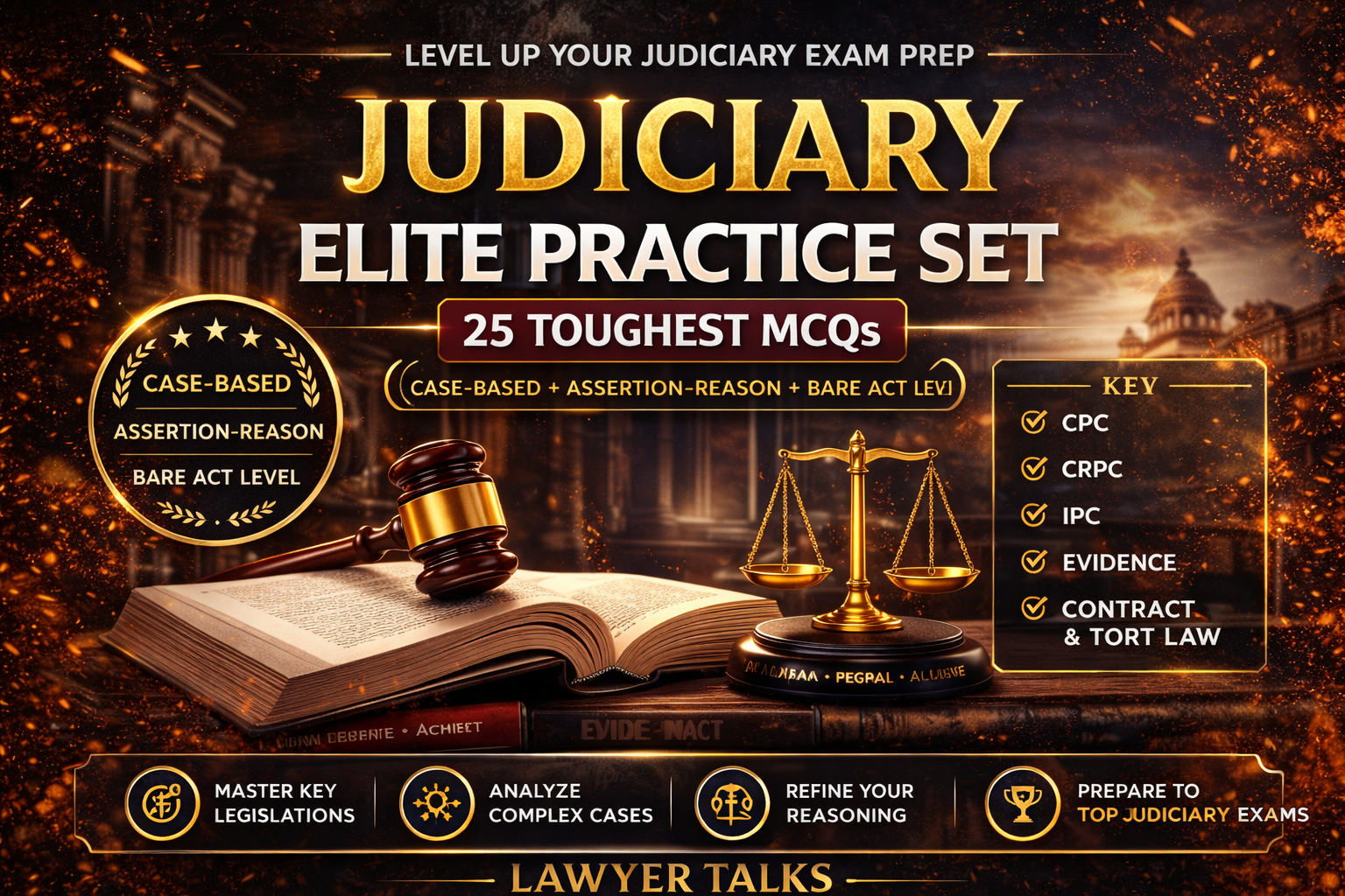 This Judiciary Elite Practice Set is designed for serious aspirants preparing for Judicial Services Examinations. It features 25 high-difficulty MCQs crafted with a mix of case-based scenarios, assertion-reason questions, and Bare Act-oriented traps.