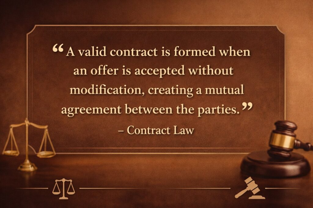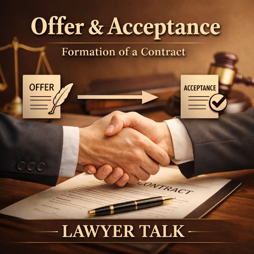In contract law, offer and acceptance form the basic foundation for creating a valid and legally binding agreement. Before a contract can exist, one party must make an offer and the other party must accept it. Once both parties agree on the same terms, the law recognizes this mutual agreement as a contract.